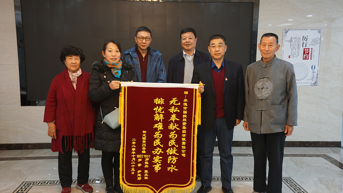 10月28日上午,市區(qū)御龍頤景小區(qū)的四位居民將一面繡有“無(wú)私奉獻(xiàn)為民做防水,排憂解難為民辦實(shí)事”的錦旗送到集團(tuán)公司,表達(dá)了對(duì)集團(tuán)公司出資解決御龍御景小區(qū)房屋漏水問(wèn)題的感謝之情。