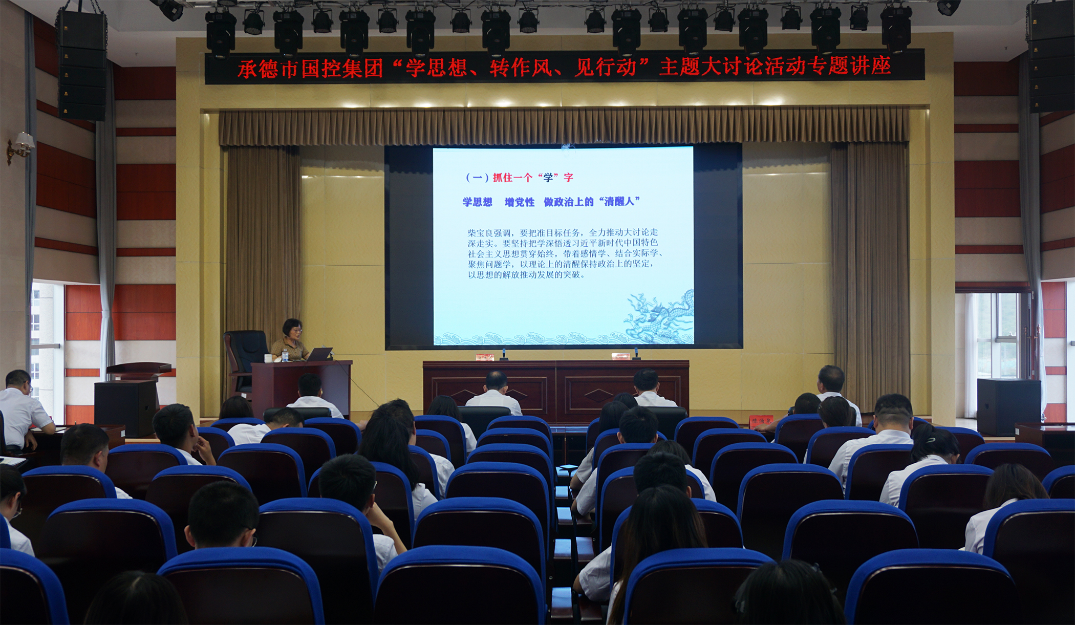 2023年7月6日,為深入學習貫徹習近平總書記關(guān)于堅持不懈抓好作風建設的重要論述,落實市委市政府關(guān)于在全市開展“學思想、轉(zhuǎn)作風、見行動”主題大討論活動精神,市國控集團邀請承德市委黨校黨史黨建教研室主任王仲娟教授,開展了“學思想、轉(zhuǎn)作風、見行動”主題大討論活動專題講座,市國控集團領導班子、集團本部全體員工、實際控制子公司中層以上負責同志及黨員員工參加講座。