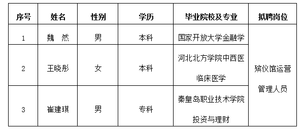 因公司發(fā)展需要,承德市國瑞置業(yè)有限公司委托第三方機構面向社會公開招聘殯儀館運營管理人員3名?,F(xiàn)對擬錄用人員信息進行公示,公示期間如有異議,可通過電話、信函等方式反映,反映意見請署真實姓名。