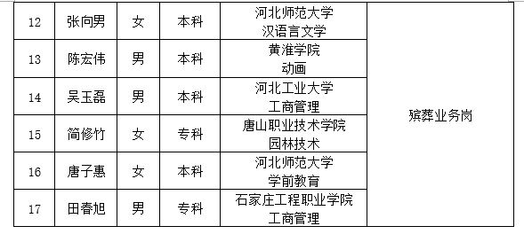 因公司發(fā)展需要,承德市國(guó)瑞置業(yè)有限公司委托第三方機(jī)構(gòu)面向社會(huì)公開(kāi)招聘殯儀館運(yùn)營(yíng)各崗位人員17名。現(xiàn)對(duì)擬錄用人員信息進(jìn)行公示,公示期間如有異議,可通過(guò)電話、信函等方式反映,反映意見(jiàn)請(qǐng)署真實(shí)姓名。