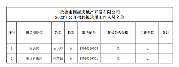 根據(jù)2023年度承德市國越房地產(chǎn)開發(fā)有限公司公開招聘工作人員的相關(guān)要求,經(jīng)過筆試、面試、體檢和考察等程序,確定袁天瑋、張夢園2名同志為承德市國越房地產(chǎn)開發(fā)有限公司擬錄用工作人員,現(xiàn)予以公示。公示期間如有異議,可通過電話、信函等方式反映,反映意見請署真實姓名。